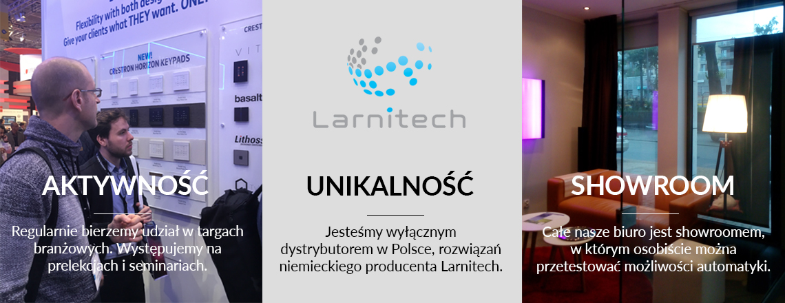 Ze względu na niezawodność, stabilność, bezpieczeństwo oraz najlepszą funkcjonalność wtkorzystujemy rozwiązania producenta Larnitech. Jesteśmy także certyfikowanym partnerem KNX Association. Dodatkowo współpracujemy z wieloma firmami i dostawcami sprzętu tak aby zapewnić naszym klientom szeroką gamę produktów.